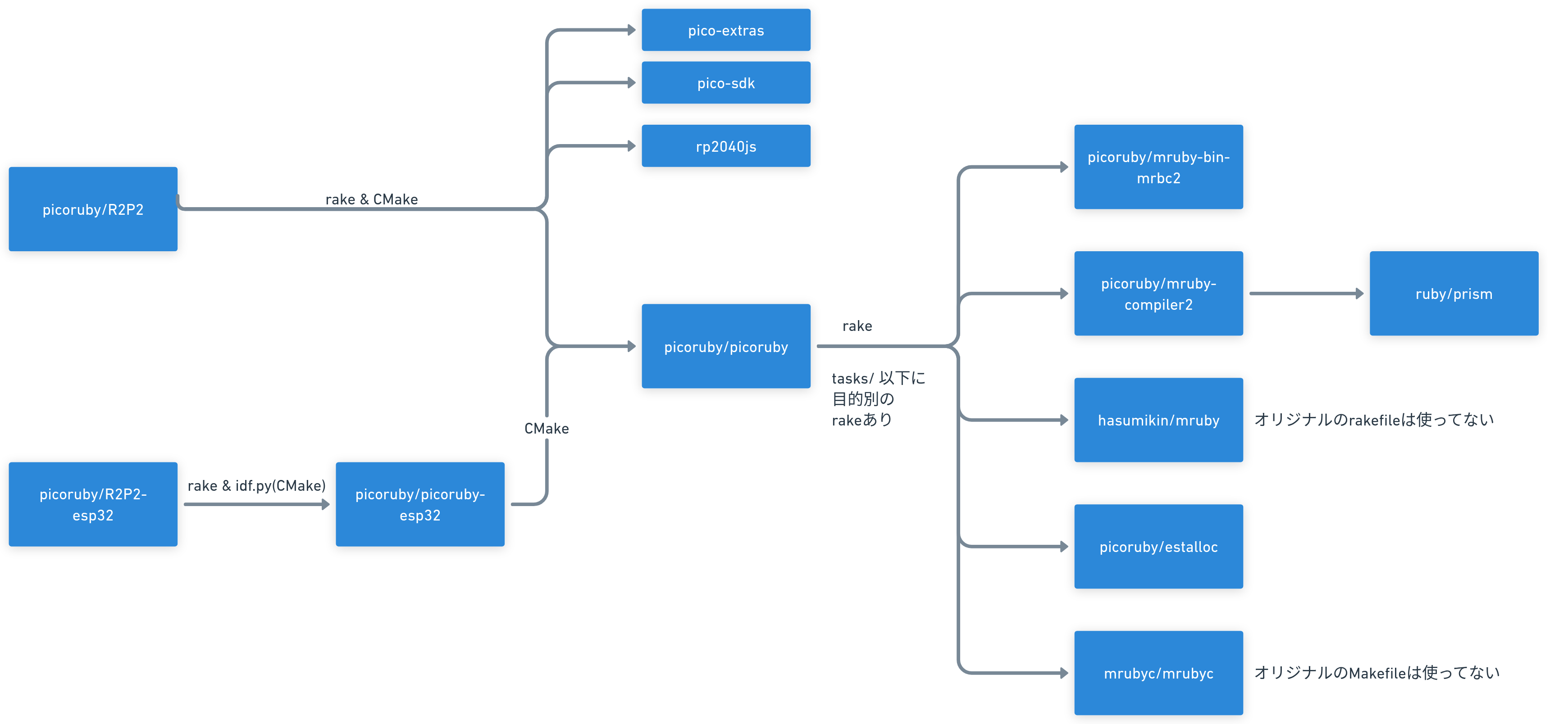 rake picoruby:pico_w:prod # Build picoruby for pico_w (prod)ビルドの仕組みは、rakeとCMakeが連動していて、かつ多段でビルドしたり、生成されるバイナリが複数あったりと、すこし複雑です。