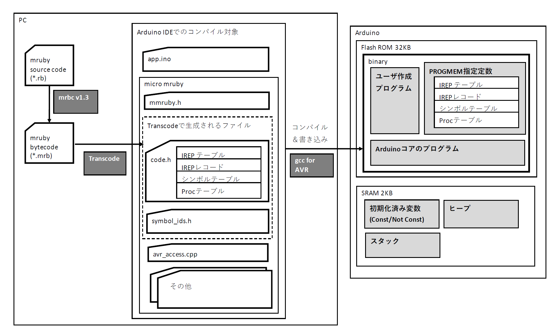 - ArduinoIDEでコンパイルでは、8bitマイコンでも、8bit以上の変数を扱えるように対応してくれているので、mruby/cベースのコードもコンパイルできた